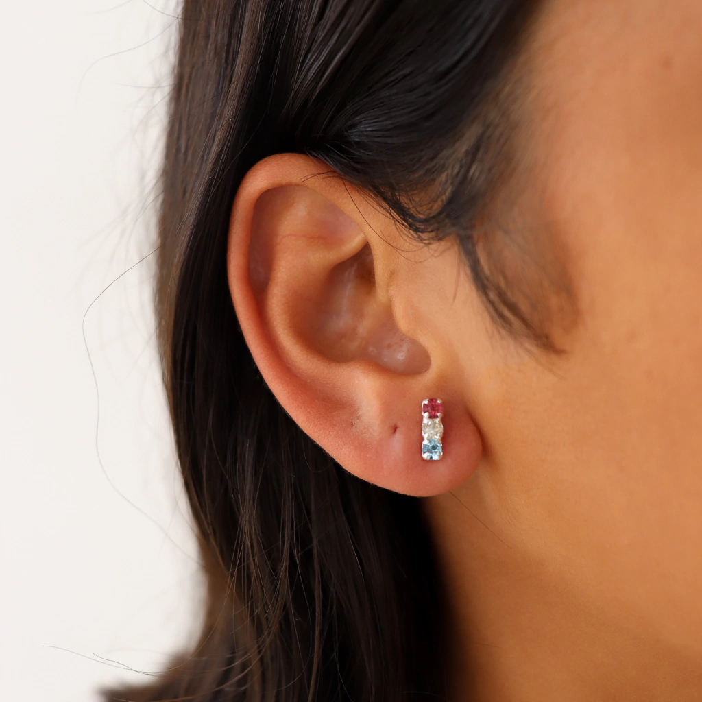 Brinco pequeno, de tarracha, com 3 zircônias coloridas.