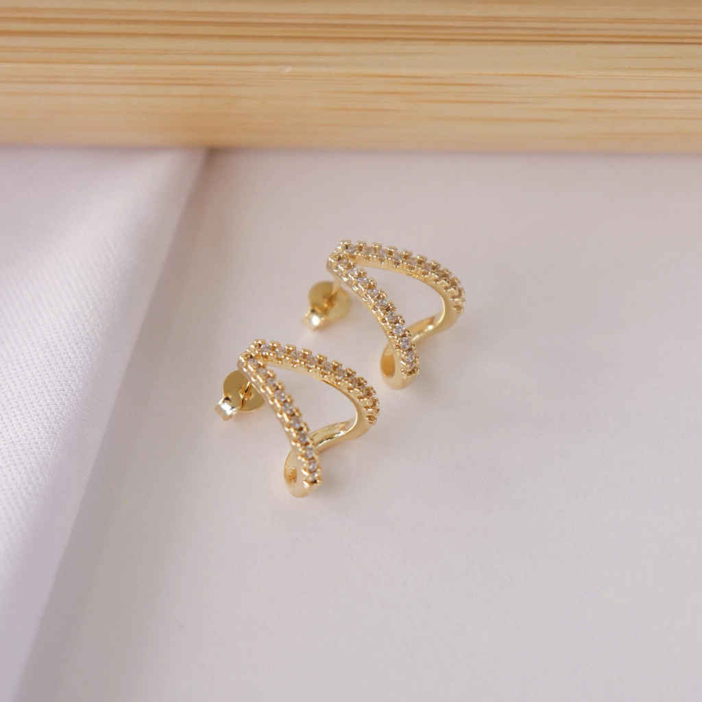 Brinco de tarracha, em formato V pra baixo da orelha e todo cravejado de zircônias.