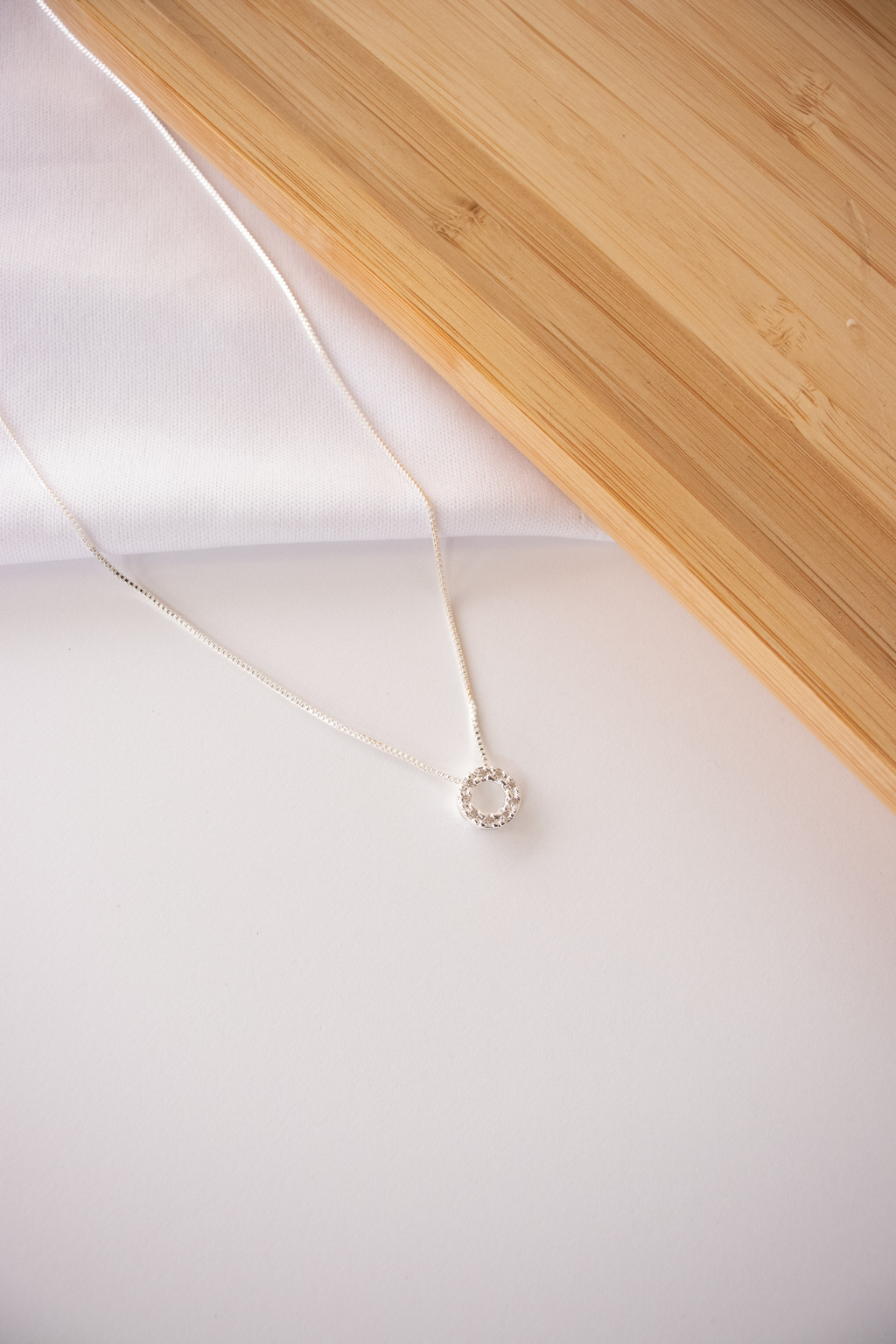 Cordão veneziana, com pingente de circulo cravejado e pequeno.